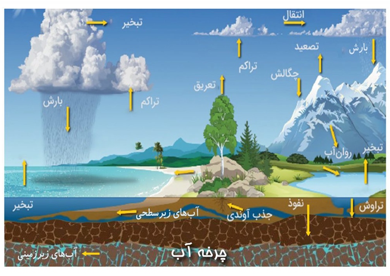 چرخه آب نقطه آغاز و پایانی ندارد. این چرخه، میلیاردها سال است که در حال کار و شکل دادن به طبیعت پیرامون ماست. تابش خورشید، موتور محرکه چرخه آب است که باعث تبخیر آب دریاها و آب موجود در برگ گیاهان میشود. آب بخار شده، به خاطر چگالی کمی که دارد، بالا میرود. بخشهایی از این بخار، متراکم میشود و ابرها شکل میگیرند. در شرایط مناسبی، ابرها شروع به باریدن میکنند که بخشی از آن به سطح زمین میرسد و بخشی دیگر در طول مسیر دوباره بخار میشود. آبی که به سطح زمین میرسد، گاهی جاری میشود و به سمت مناطق پست و با ارتفاع کمتر میرود و رودها، برکه ها، تالابها و در نهایت دریاها و اقیانوسها را شکل میدهد. بخشی دیگر از آب باران، از طریق خاک به درون زمین نفوذ میکند و اگر شرایط مناسب باشد، تا اعماق طولانی، پایین میروند و سفرههای آبزیرزمینی را تشکیل میدهند و با سرعت آرامی به حرکت خود ادامه میدهند. در زمانی طولانی یا کوتاه، این آبها نیز مجدد از طریق چشمهها، چاهها و قناتها به سطح زمین آمده و در فرصتی، با انرژی که از تابش خورشید میگیرند، دوباره بخار میشوند و چرخه ادامه پیدا میکند.